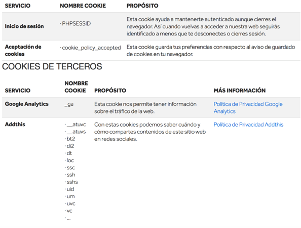 Esta web utiliza tanto 'cookies' de sesión, temporales, como 'cookies' permanentes. Las 'cookies' de sesión almacenan datos mientras el usuario accede a la web, caducan al cerrar el navegador; mientras que las 'cookies' permanentes almacenan los datos en el terminal para que sean accedidos y utilizados en más de una sesión, suelen caducar cuando transcurre un periodo de tiempo que puede oscilar entre los dos meses y los dos años. Las cookies empleadas son tanto propias como de terceros, e incluyen tanto cookies técnicas, como de personalización y de análisis. En concreto esta web emplea las siguientes cookies: